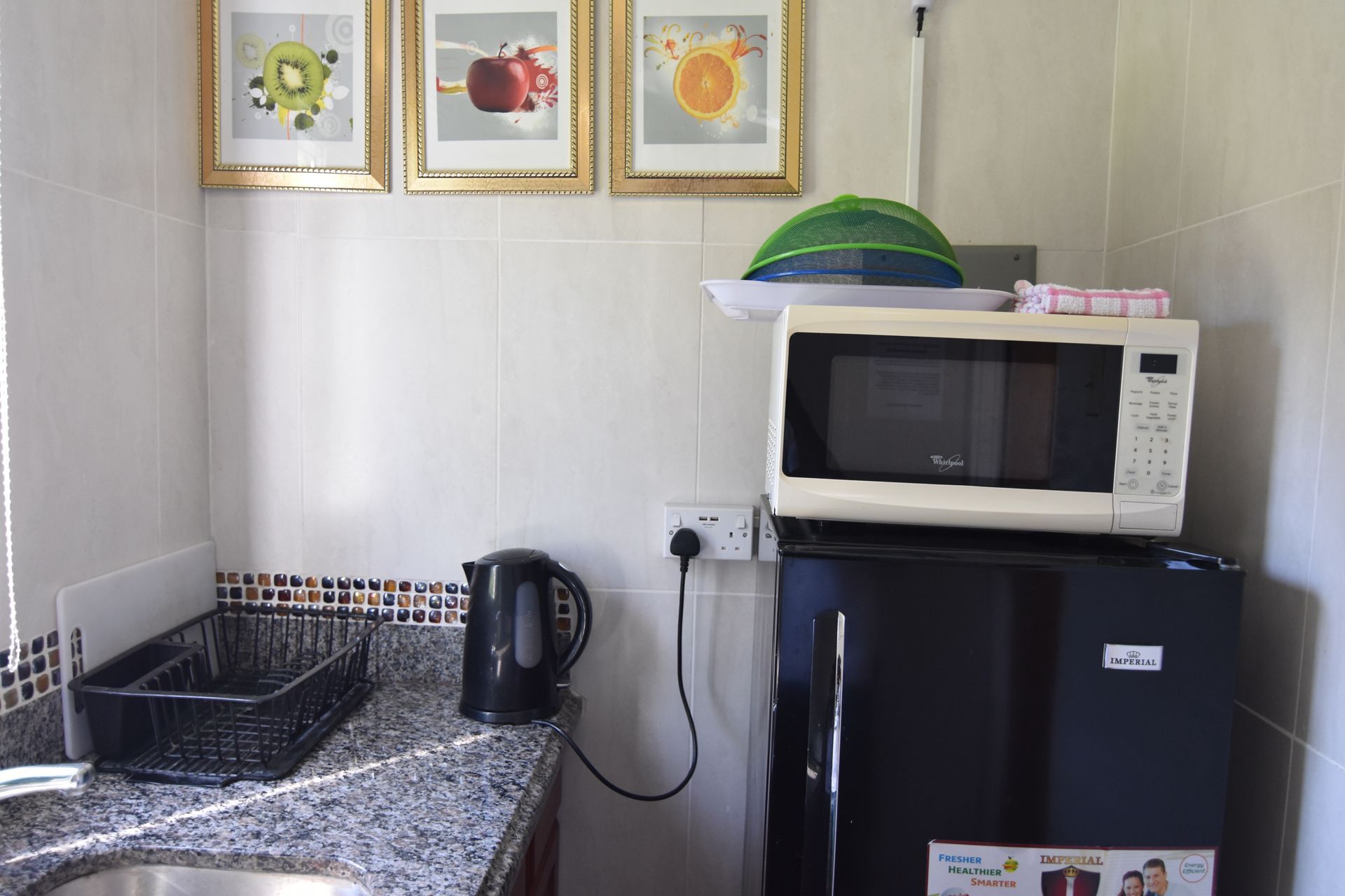 The kitchen is fully loaded with fridge freezer, cooker, toaster, microwave