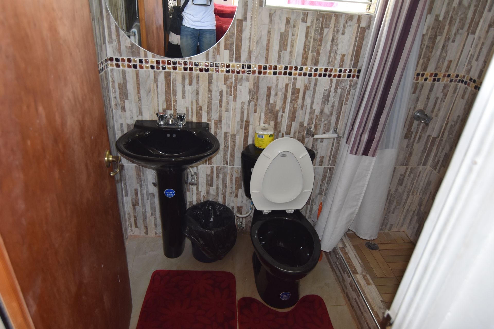 Bathroom has hot water shower, toilet, also washbasin