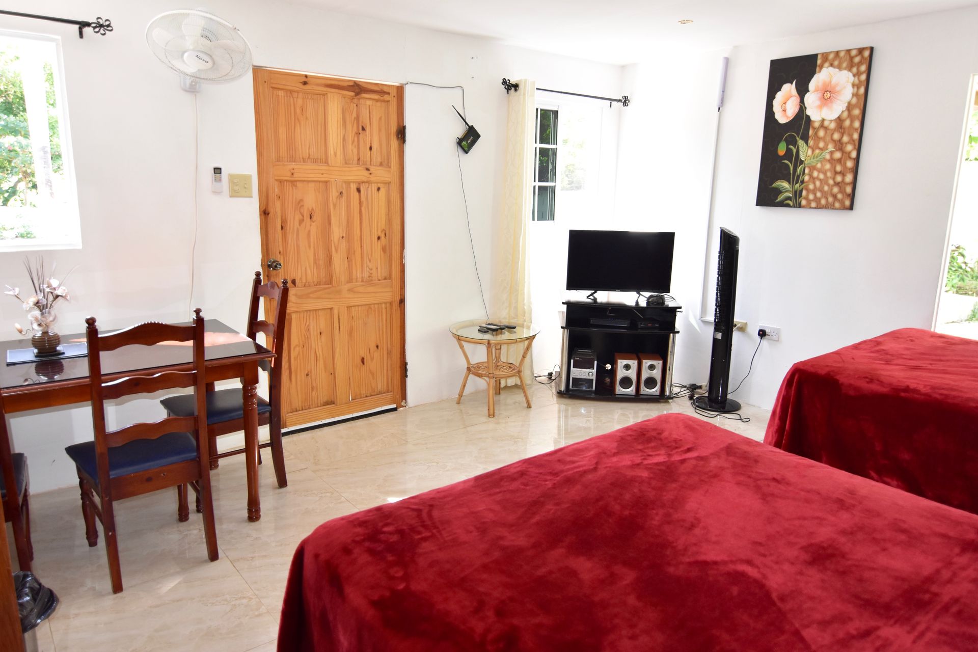 This property consists of one spacious large room with 2 double beds, air-conditioning, cable TV, sound system, dining table seating 4 people, wardrobe, with separate kitchen also bathroom, along with free Wi-Fi.